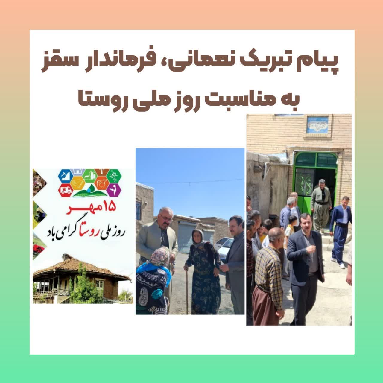 اینجانب با گرامیداشت ۱۵ مهرماه، روز ملی روستا را به تمام روستاییان شریف و پرتلاش، دهیاران، اعضای شوراd اسلامی روستاها و فعالان حوزه توسعه روستایی شهرستان سقز تبریک عرض مینمایم.