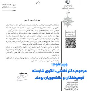 ۱۴۰۴/۹/۵حسین سیمایی، وزیر علوم، تحقیقات و فناوری، در پیامی، درگذشت استاد محمد فاضلی سقزی را ضایعه بزرگ و جبران ناپذیری برای نظام علمی و آموزشی کشور برشمردند.